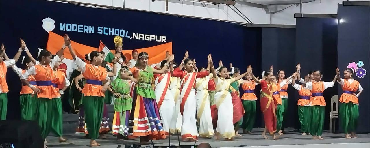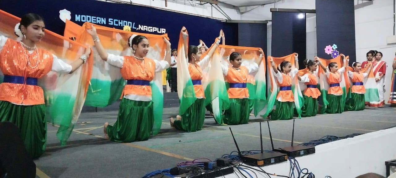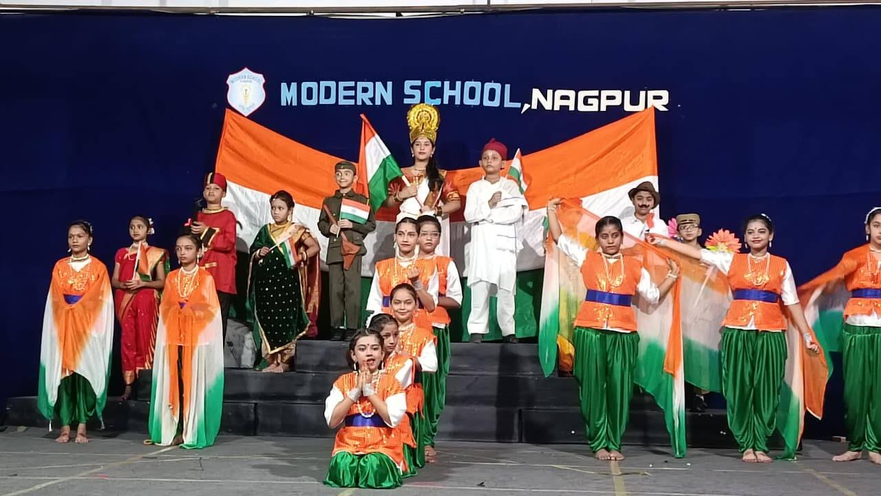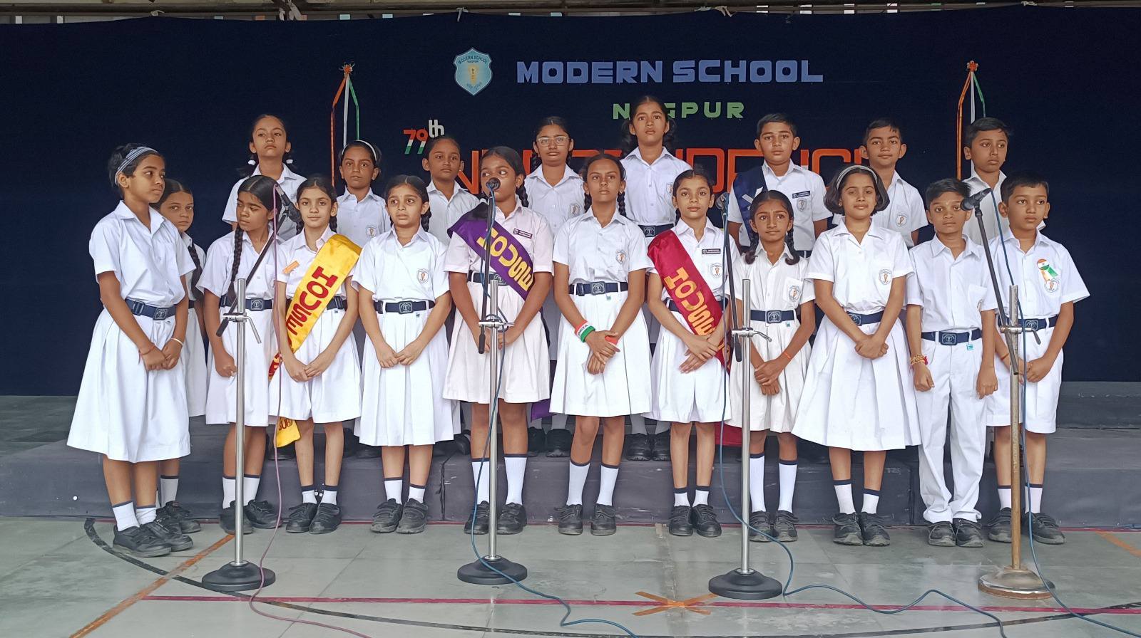 79th Independence Day Celebrations at Modern School, Koradi Road celebrated with great zeal and patriotic fervor. The event was graced by the esteemed presence of the Directors of Modern School Mr. Mohan Madhav Gandhe, Mr. Amit Surendra Yenurkar, CA Gaurav Indarchand Jaipuriya, Mr. Arvind Parmanand Khare, and CMA Mukund Vishnu Deshpande along with Miss Rupali Dey, Principal, and Miss Asha Deshraj, Headmistress.