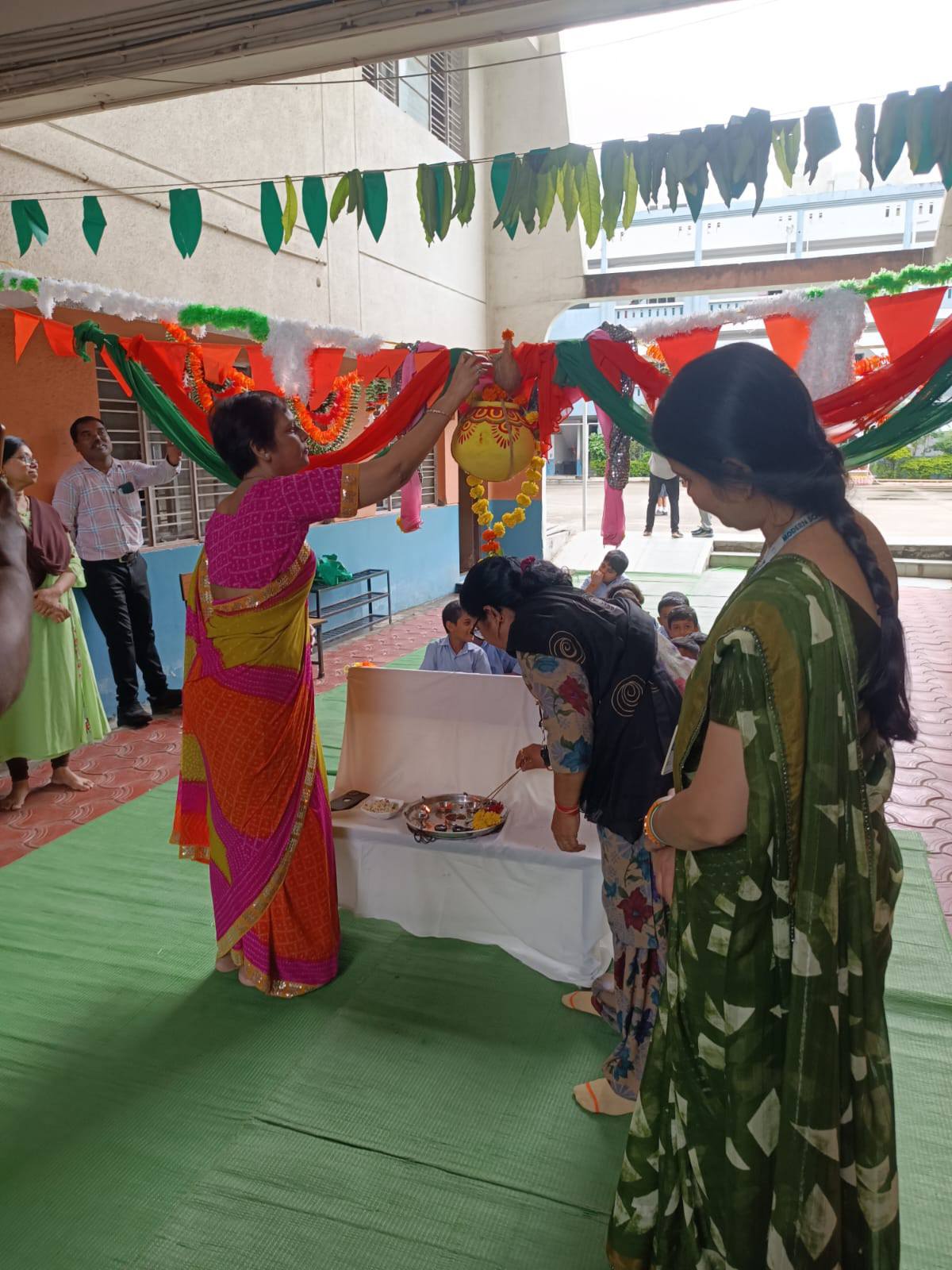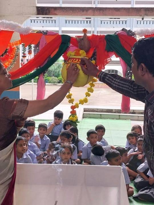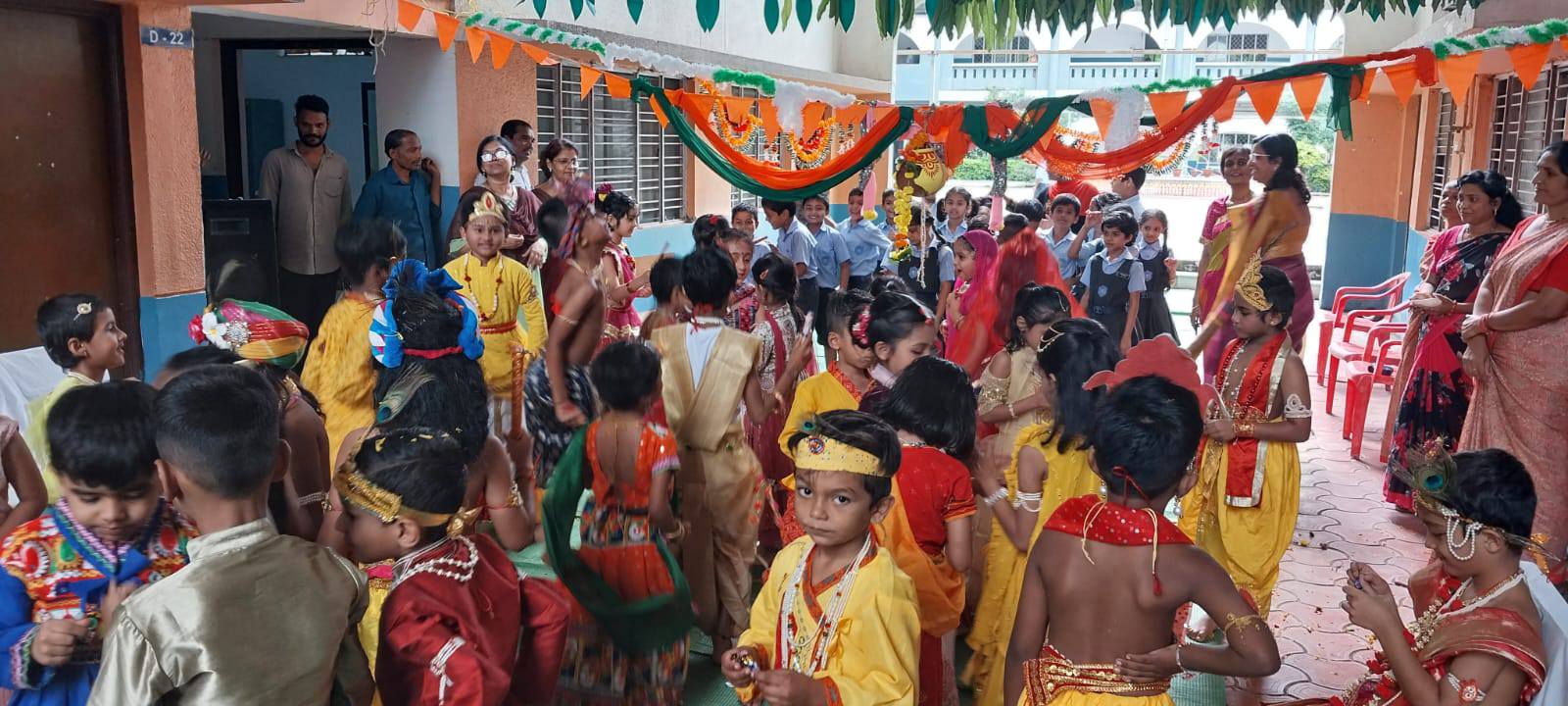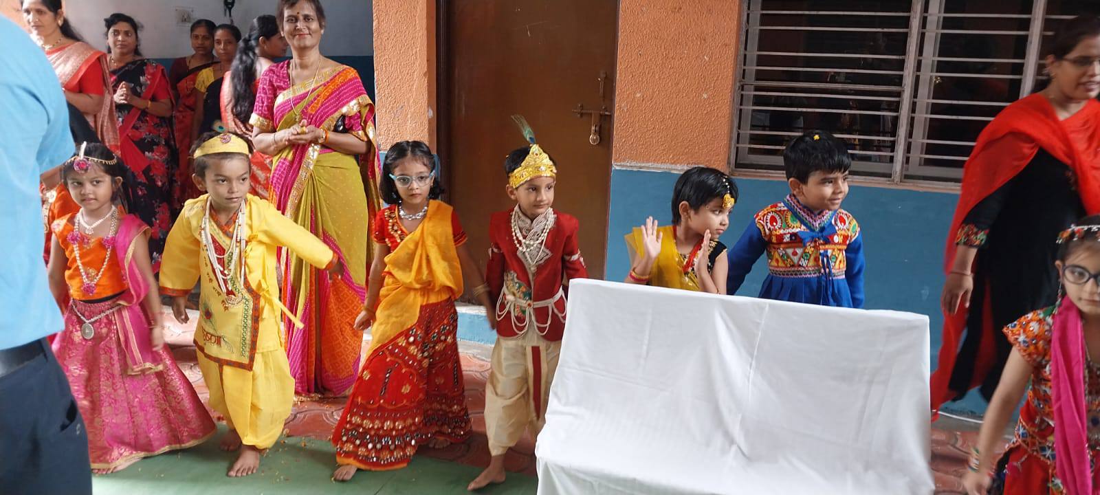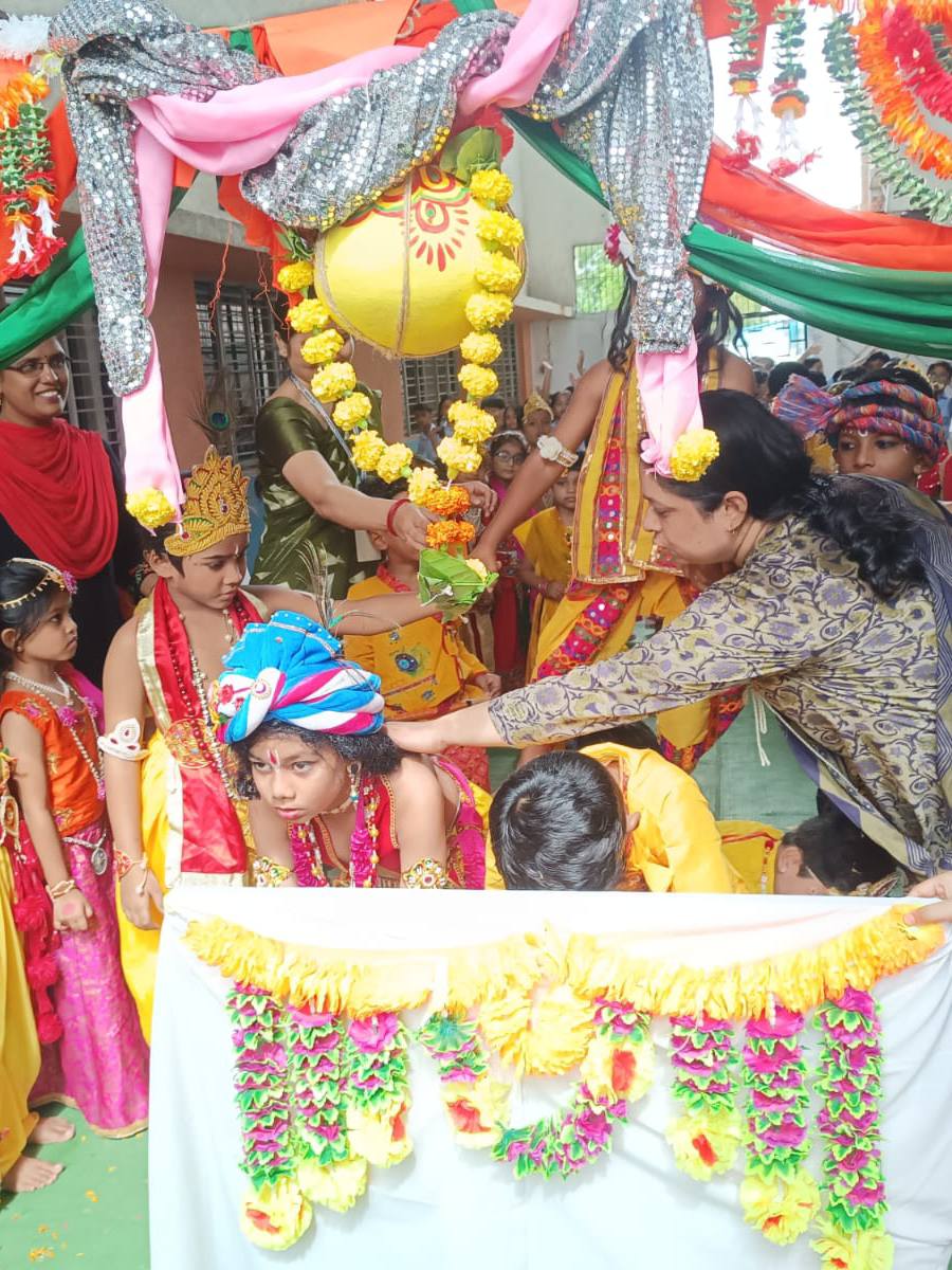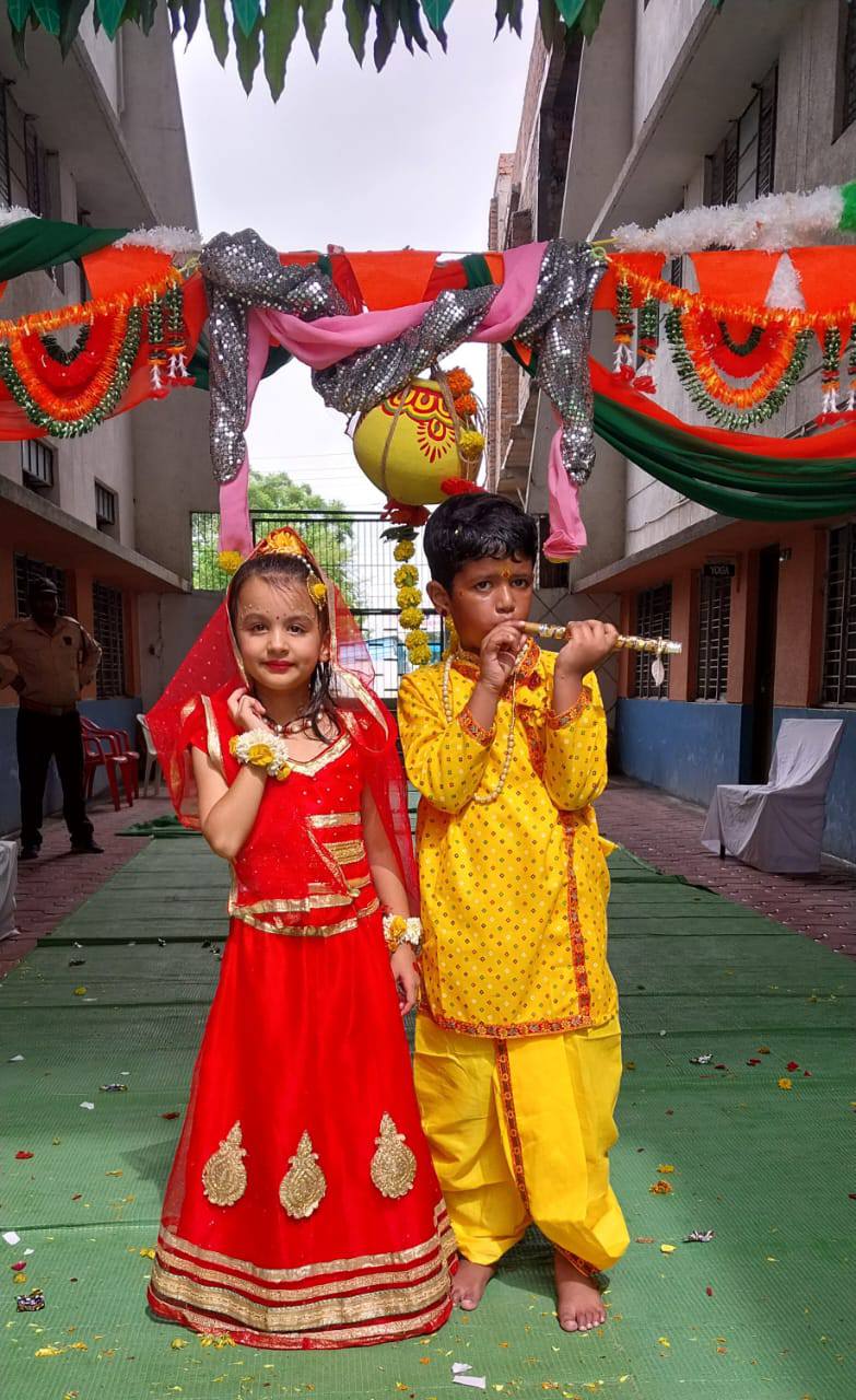 The program started in the assembly. Mast. Saransh Verma of standard 4 shared his thoughts about Janmashtami . Displaying great excitement the tiny tots of std 1 were dressed up as Radha and Krishna.Then finally the program was cherished more by Dahi Handi program.